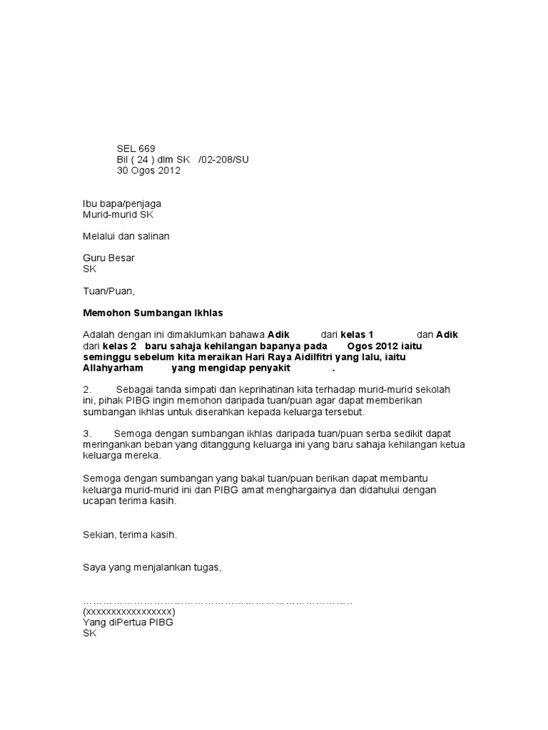 Beberapa contoh surat sumbangan khairat kematian terbaru 2019. Jenis surat keterangan kematian berkode. Diunggah oleh ahmad jamal bin jamil. Tuan pegawai hj non hanifah bin hj adam kg batu hampar lorong jawa 01455 simpang kuala alor star kedah. Contoh surat memohon sumbangan derma pembangunan surau alfirdaus taman garing utama rawang selangor. 1 1 mendukung 0 0 menolak.