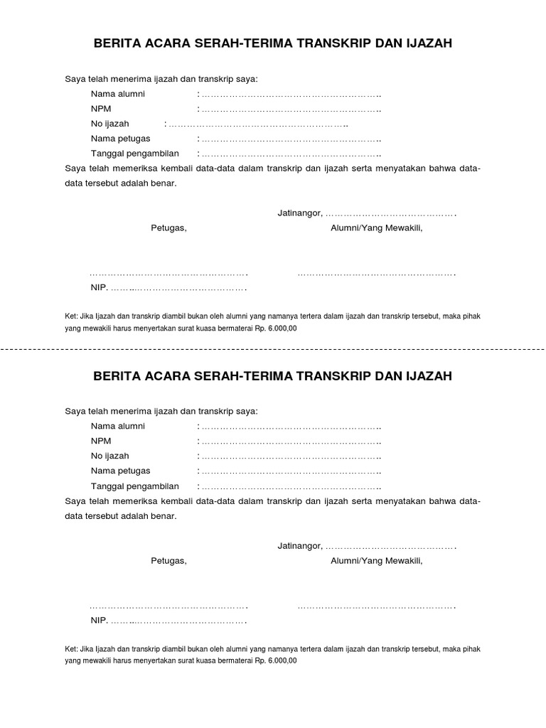 Berita acara serah terima ijazah sabar darono add comment. 15 contoh surat kuasa pengambilan ijazah paling lengkap bagi orang yang sudah menyelesaikan pendidikan baik itu jenjang sd smp sma sampai dengan kuliah tentu akan memiliki ijazah. 15 contoh surat tanda terima uang barang dan dokumen berbagai contoh dan jenis surat tentu tidak bisa terlepas dari berbagai kegiatan perusahaan instansi pemerintahan organisasi lembaga dan berbagai kelompok lainnya. Dengan mengetahui namanya tentu anda sudah bisa menebak bahwa di dalam surat ini nantinya berhubungan dengan barang yang dikirim dan diterima oleh seseorang yang melakukan transaksi pengiriman barangbiasanya surat ini akan diselipkan atau dibawakan kepada seseorang yang bertugas untuk mengirimkan barang tersebut. Daftar nama lulusan terlampir.