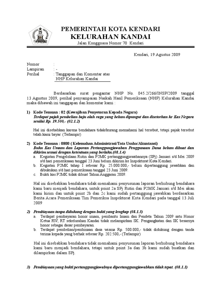 Tanggapan atas temuan pemeriksaan bpk terhadap pelaksanaan pemilu 2004 investigatif nomor 5 dari hasil pemeriksaan yang dilakukan oleh tim audit badan pemeriksa keuangan republik indonesia bpk ri sub tim audit ti kpu mengemukakan hal sebagai berikut. Format gambar contoh surat balasan temuan inspektorat terbaik 2019. Hasil pemeriksaan untuk menguji kepatuhan pemenuhan kewajiban perpajakan harus diberitahukan kepada wajib pajak melalui penyampaian sphp surat pemberitahuan hasil pemeriksaan yang dilampiri dengan daftar temuan hasil pemeriksaan. Hasil pemeriksaan final versi pemeriksa pajak adalah surat ketetapan pajak skp baik skpkb skblb maupun. Surat pemberitahuan perpanjangan jangka waktu penyampaian tanggapan hasil pemeriksaan 35. Contoh surat tanggapan pajak untuk berbagai keperluan sebagai referensi pembuatan surat yang baik dan benar serta dapat diunduh secara gratis.