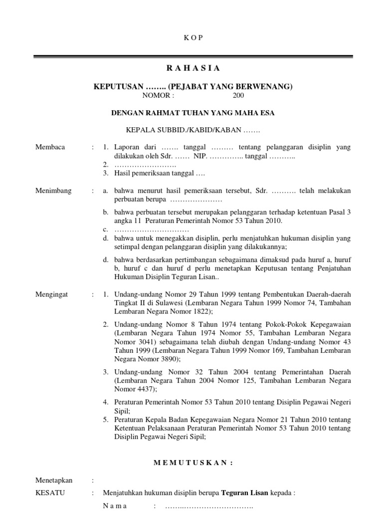Contoh surat teguran tertulis pns pp 53 tahun 2010. Nomor 53 tahun 2010 tentang disiplin pegawai negeri sipil dengan rahmat tuhan yang maha esa presiden republik indonesia menimbang. Tujuan pemeriksaan yang dilakukan ini adalah untuk mengetahui benar atau tidak pns yang bersangkutan melanggar disiplin faktor faktor yang mendorong pns tersebut melakukan pelanggaran disiplin serta dampak atau akibat. Anjab kasubbag admumum dan kepegawaian. Bahwa peraturan pemerintah nomor 30 tahun 1980 tentang peraturan disiplin pegawai negeri sipil sudah tidak sesuai. Untuk membatasi atau mencegah pelanggaran ini maka atasan berhak memberikan contoh suat teguran tertulis pegawai negeri sipil.