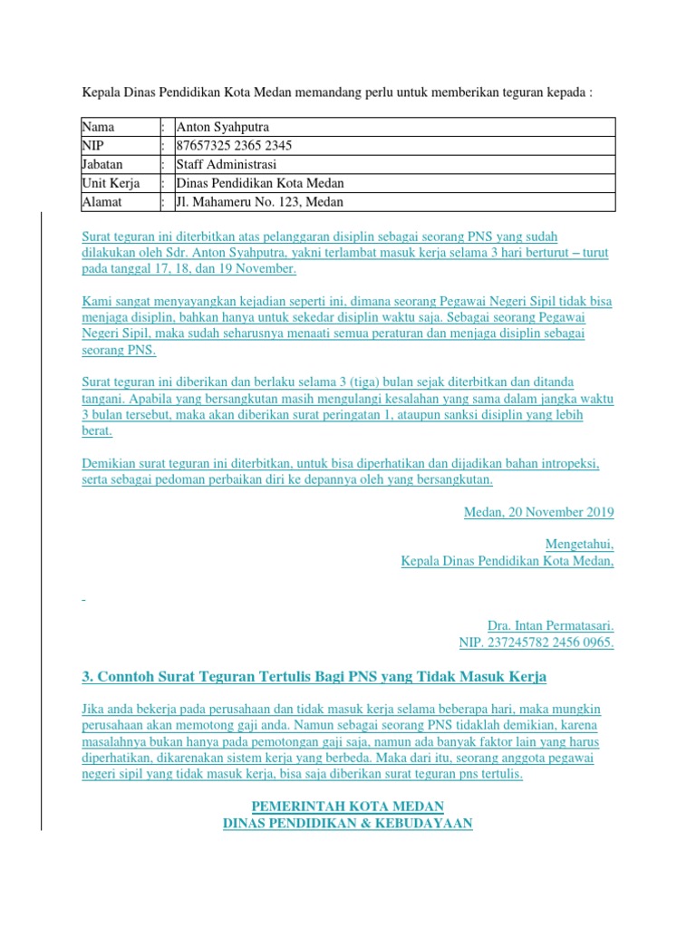 Contoh surat teguran tertulis bagi pns yang tidak masuk kerja. Contoh surat teguran teguran merupakan sebuah makna dimana seseorang atau atasan yang memiliki wewenang untuk menegur atau memberi peringatan kepada bawahan yang melakukan pelanggaran terhadap aturan aturan yang berlaku di sebuah perusahaan. Kita juga harus berkomitmen pada kontrak perjanjian yang telah kita sepakati di awal ketika kita masuk menjadi karyawan di. Contoh surat peringatan tidak masuk kerja untuk pns yang dapat di download secara gratis ini sebagai bahan informasi bagi anda yang ingin mengetahui surat peringatan dengan format yang resmi dan profesional. Surat teguran pns tidak masuk kerja biasanya akan diberikan kepada pns yang absen tanpa pemberitahuan. Contoh surat teguran tertulis bagi pns yang tidak masuk kerja ada banyak. Apalagi jika kita adalah seorang karyawan pada sebuah perusahaan.