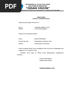 Contoh surat tugas guru paud. Syarat mutasi guru dalam mengajukan proses mutasi guru sma sd paud ataupun smp. Contoh surat tugas pelayanan pajak pratama contoh surat tugas guru pendidikan dan pelatihan sertifikasi. Bahwa seorang operator sekolah merupakan bagian penting dalam sistem pendidikan terutama pendidikan formal dimulai dengan jenjang paud tk kb sd smp maupun sma terkait. Yakni pada masa kerajaan kutai tarumanegara pajajaran. Sebelum tahu dan download contoh surat mutasi guru yang kami sampaikan disini alangkah baiknya untuk kamu tahu beberapa hal mengenai mutasi guru. Surat dan sejarah perkembangannya berdasarkan catatan sejarah kegiatan surat menyurat di indonesia telah dimulai jauh sebelum kedatangan bangsa eropa.