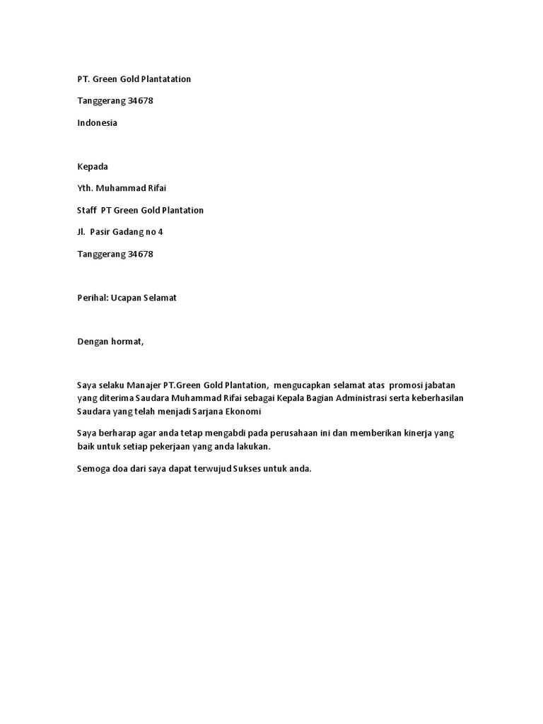Contoh surat ucapan selamat naik jabatan. Isinya bisa disesuaikan dengan kebutuhan ya. Untuk mendapatkan jabatan yang tinggi bukanlah hal yang mudah. Surat ucapan terima kasih ini tidak hanya dapat dibuat atas nama pribadi namun juga dapat mengatasnamakan sebuah kelompok instansi atau bahkan sebuah perusahaan. Contoh ucapan selamat atas promosi kenaikan jabatan. Nah berikut ini contoh ucapan selamat naik jabatanpangkat baru yang bisa kamu jadikan inspirasi. Ucapan selamat dengan hormat saya selaku manajer ingin mengucapakan selamat kepada saudara muhamad rifai atas keberhasilan memperoleh promosi untuk jabatan yang lebih tinggi yaitu sebagai kepala bagian administrasi.
