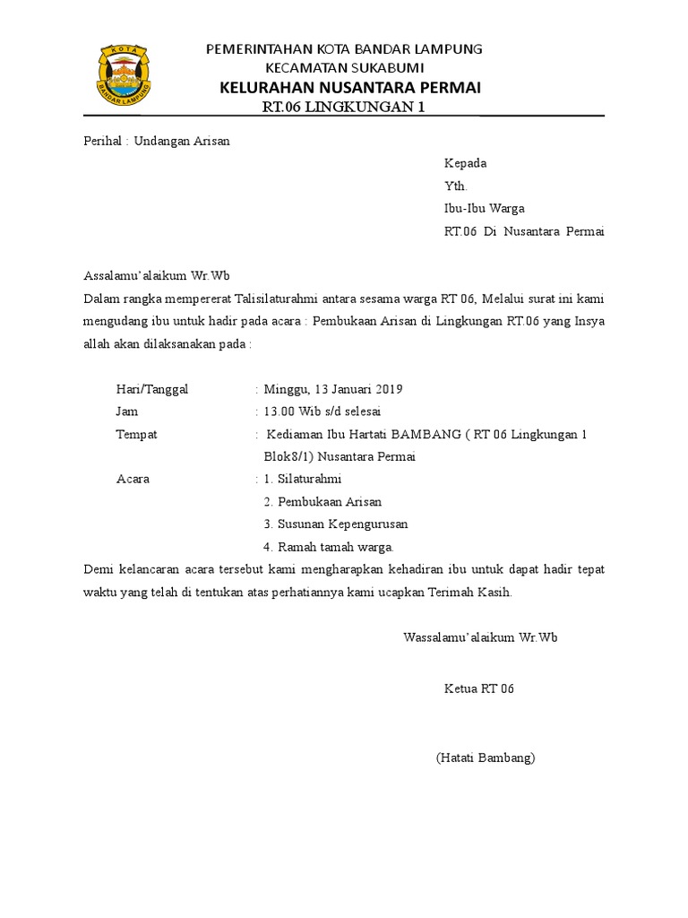 Ada sebuah kegiatan arisan yang diikuti oleh ibu ibu yang berada di lingkungan rt. Download 1278 kb info lengkap. Yang terhormat ketua rt 01 desa ronggo. Keduanya memiliki karakteristik yang berbeda dan digunakan untuk keperluan yang tidak sama. The collection that consisting of chosen picture and the best amongst others. Contoh surat undangan kita tahu surat undangan adalah sebuah tulisan di dalam kertas yang memuat ajakan kepada orang lain baik perorangan maupun kelompok untuk menghadiri kegiatan tertentu.