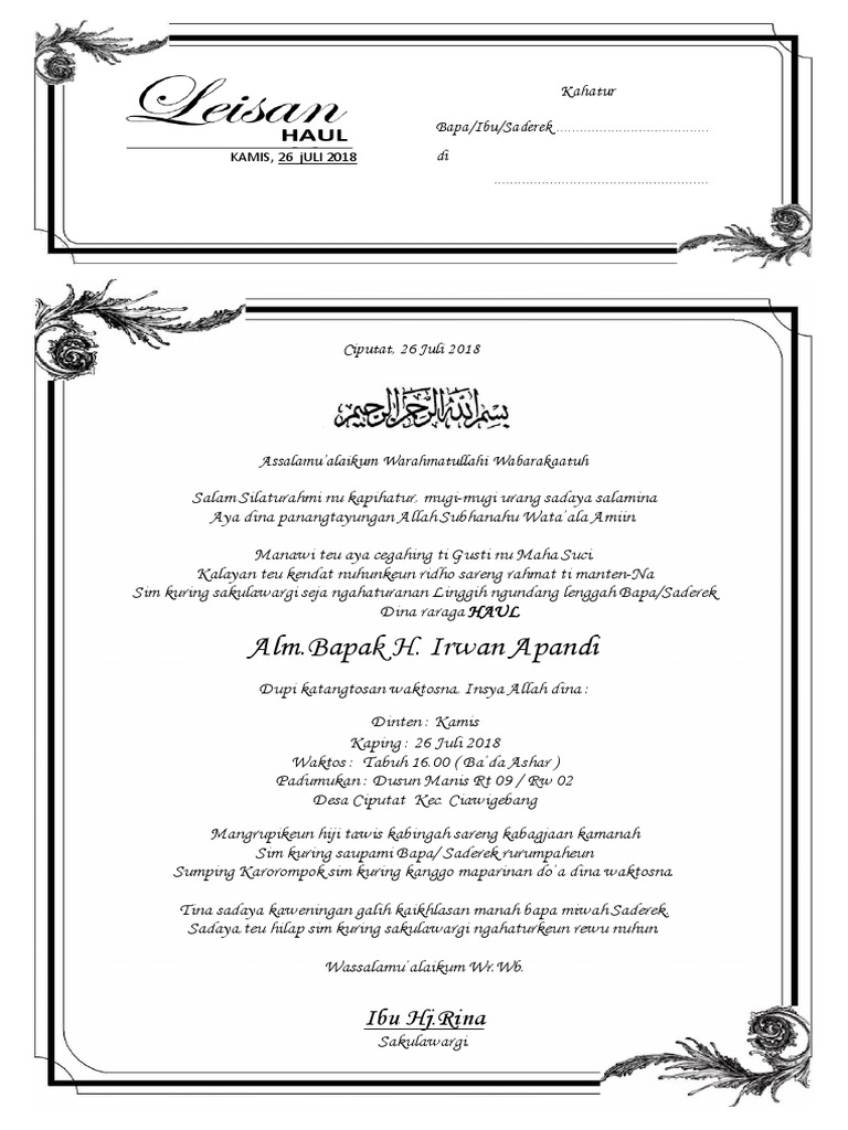 Contoh undangan dalam bahasa sundauleman dina bahasa sunda posted by revolusi pendidikan on 645 am under bahasa sunda. Contoh serat ulem wisuda sma undangan aqiqoh format ps contoh uleman syukuran bahasa sunda surat setengah resmi ucapan komuni pertama cetak undangan murah di pagarsih bandung undangan bukber bahasa sunda cover yasin psd contoh motto reuni harga undangan gulung 2016 sambutan pembubaran panitia pernikahan bahasa jawa surat uleman maulid nabi ulang tahun anniversary corel desain. Contoh surat undangan kerja bakti bahasa sunda hallo sahabat belajar bahasa sunda pada kesempatan kali ini admin akan membagikan bagaimana contoh surat undangan kerja bakti dalam bahasa sunda sebetulnya contoh surat bahasa sunda tidak jauh berbeda dengan surat pada umumnya hanya saja penggunaan bahasanya saja yang membedakan tetapi terkadang karena berbagai hal kita dituntut untuk membuat.