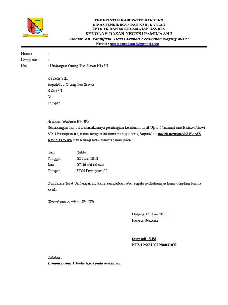 Contoh surat undangan kelulusan. Contoh format penulisan surat keterangan kelulusan. Contoh surat undangan pengumuman lulus ujian nasionan atau ujian sekolah berstandar nasional untuk jenjang sdmi akan dilaksanakan pada minggu ke tiga bulan mei 2017. Jadwal ujian nasional yang sudah disampaikan melalui pos un yaitu tanggal 15 16 dan 17 mei 2017 untuk ujian utama dan tanggal 22 23 dan 24 mei 2017 untuk ujian nasional susulan. Contoh surat undangan rapat rapat adalah unsur penting dalam sebuah organisasi lembaga instansi komunitas dan semacamnya. Undangan pengumuman kelulusan ujian nasional harus diberikan paling lambat 1 hari sebelum pelaksanaan pengumuman. Berbagi ke twitter berbagi ke facebook edit.