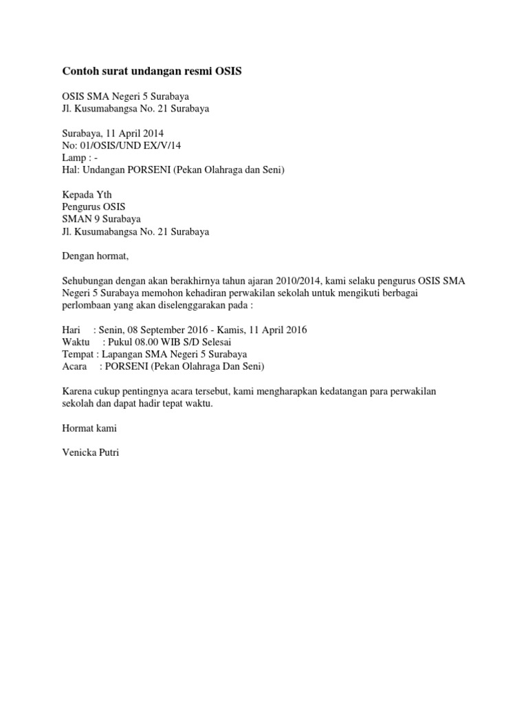 Contoh surat undangan osis. Referensi contoh surat undangan resmi organisai osis sekolah. Keduanya memiliki karakteristik yang berbeda dan digunakan untuk keperluan yang tidak sama. Contoh surat resmi osis perihal undangan rapat. Contoh surat undangan rapat resmi. Rta milono km 15 komp. Surat undangan dapat berupa surat resmi maupun tidak resmi.