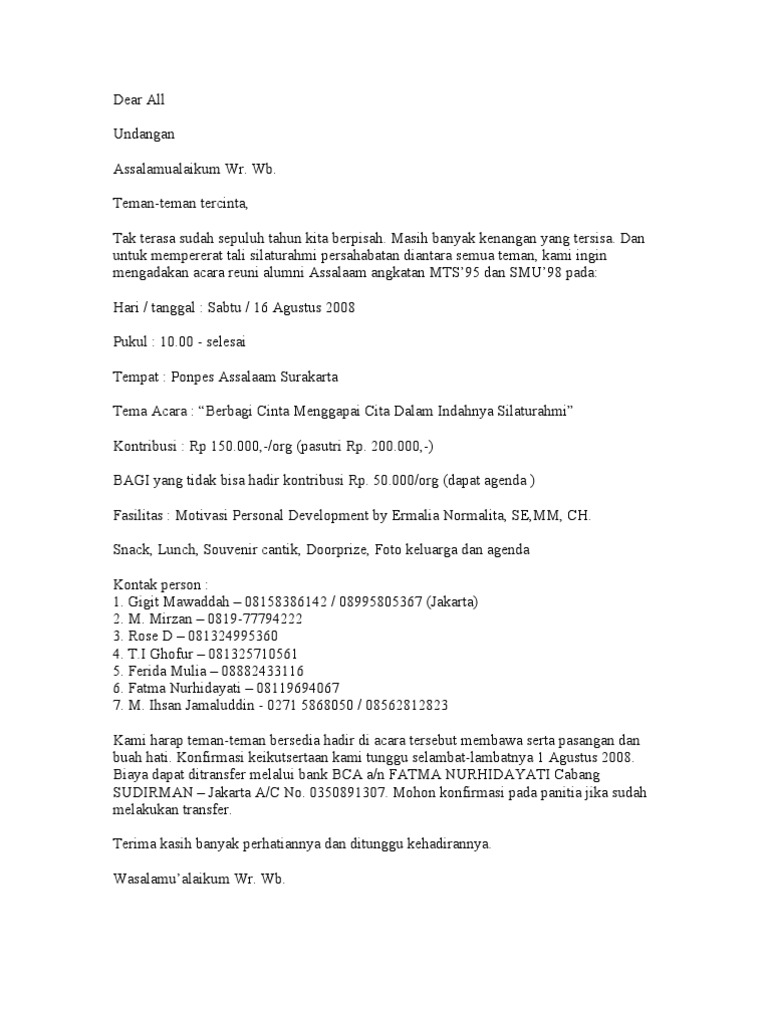 Contoh surat undangan apabila anda ingin mengadakan suatu kegiatan dan ingin mengundang banyak pihak anda pasti membutuhkan surat undangan. Contoh undangan reuni sekolah dasar. Jika anda adalah seorang karyawan atau staf perusahaan mungkin tertarik melihat artikel lainnya silahkan baca di contoh surat bisniskembali ke topik bahasan pada artikel kali ini akan. Contoh surat undangan formal reuni reuni adalah acara pertemuan yang diadakan untuk ber silaturahmi atau bertemu kembali setelah lulus dari sebuah sekolah atau akademi tertentu. Kali ini masih berkaitan dengan undangan kita akan belajar untuk membuat surat untuk acara reuni. Pada pembukaan tertulis hampir sama dengan umumnya surat undangan untuk penutup nya juga demikian.