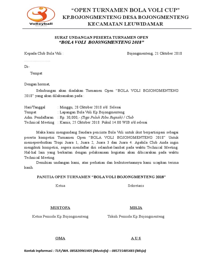 Contoh surat resmi pertandingan volly selain itu gambar ini juga memiliki berbagai ukuran. Nah tanpa banyak kata silahkan langsung diambil dan diedit contoh surat undangan pertandingan bola volly nya. Hal ini tentu saja untuk memberi tahu para team yang ada agar dapat berpartisipasi dalam turnamen tersebut. Contoh surat undangan turnamen volly inilah isi lengkap surat dari perpisahan valdes untuk barcelona victor valdes telah menulis surat untuk barcelona dengan mengatakan ucapan selamat berpisah untuk barcelona. Contoh surat undangan ke bupati. Akan tetapi visi misi yang baik menurut saya yang bisa di pertanggung jawabkan dan bisa di realisasikan untuk itu.