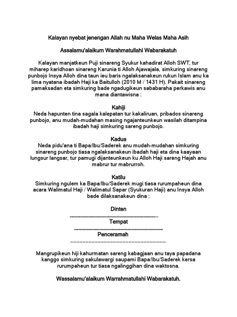 179316230 undangan haji. Contoh surat undangan syukuran keberangkatan haji walimatus safar mas edi contoh surat 9 komentar bulan dzulhijjah sebentar lagi akan tiba bulan dimana umat islam dari seluruh dunia berbondong bondong datang ke tanah suci mekah untuh melaksanakan rukun islam yang 5 yaitu melaksanakan ibadah haji. Assalamualaikum warakhmatullahi wabarokatu undangan haji contoh undangan hajatan haji haji berikut adalah isi undangan dalam syukuran keberangkatan haji 1433 h. Download undangan walimatussafar haji docundangan hatam qurandoc 142. Lansung saja berikut ini contoh penulisan undangan walimatus. Haji contoh undangan haji berikut adalah isi undangan dalam syukuran keberangkatan haji 1433 h.
