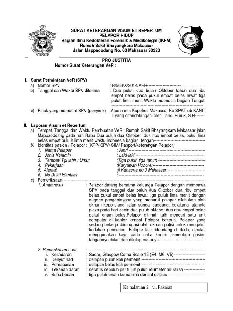Contoh surat visum et repertum. Pro justitia nomor surat keterangan ver. 90 makassar indonesia pro justitia no. Format visum et repertum perlukaan 64 3. Ver b 130xi201 4spk tanggal. Contoh surat visum et repertum ver surat visum et repertum vr adalah sebuah surat yang secara resmi dikeluarkan oleh pihak tenaga ahli dokter forensik atau dokter perihal pemeriksaan yang dilakukan terhadap luka luka atau jenazah yang nantinya dalam surat ini akan dijelaskan sebuah kesimpulan yang mendeskripsikan bentuk jenis beratnya sebuah luka dalam sebuah. Surat keterangan visum et repertum.