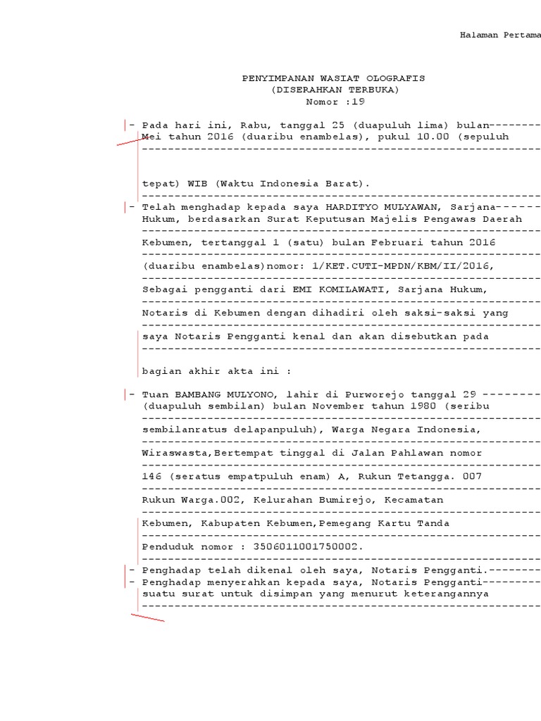 Contoh surat wasiat olografis s u r a t w a s i a t. Jenis surat wasiat selanjutnya adalah olografis pada surat ini si pewasiat akan menulisnya sendiri beserta pemberian tanda tangan di dalamnya sekaligus. Contoh surat wasiat pun cukup banyak. Namun surat wasiat yang telah ditulisnya tersebut kemudian diserahkan dan disimpan di notaris melalui proses penyimpanan dengan yang dinamakan akta penyimpanan wasiat. Atas penyimpanan itu kemudian notaris membuatkan akta penyimpanannya yang ditandatangani oleh notaris pemberi wasiat dan saksi saksi. Surat wasiat olografis terbuka penulis menyerahkan pada notaris sehingga notaris dapat melihat dan membaca surat itu untuk memahami isinya kemudian memberikan keterangan mengenai penyimpanan itu di bagian bawah surat wasiat.